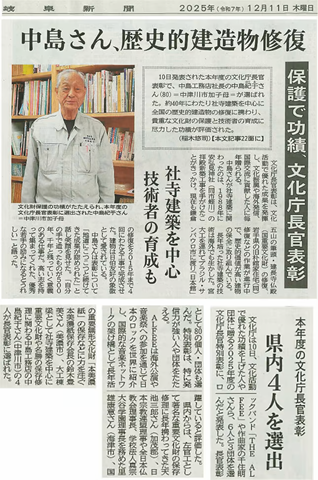 2025年12月、中島工務店社長・中島紀干さん(岐阜県中津川市加子母)が2025年文化庁長官表彰を受賞した。